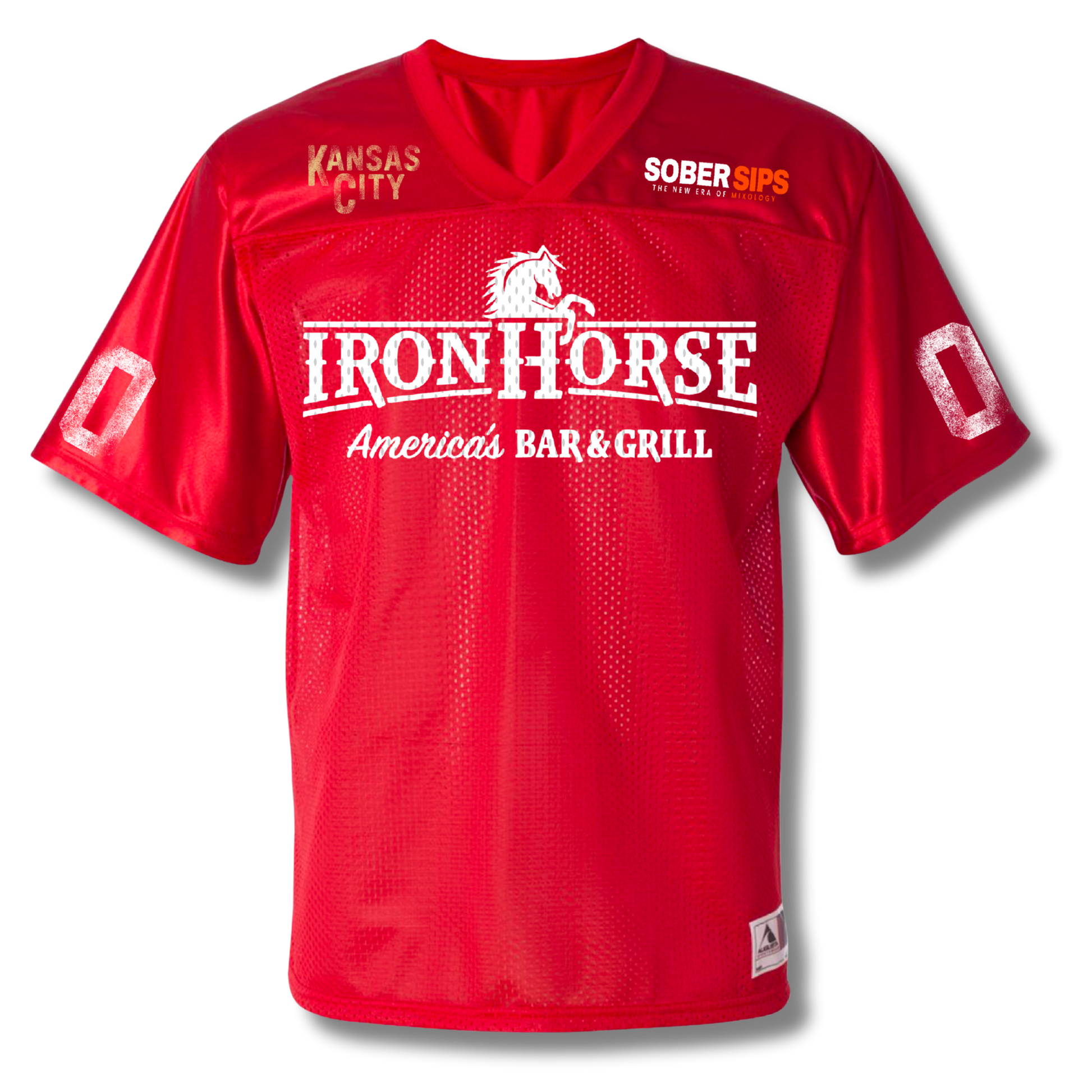 Designed in classic Chiefs red with distressed “00” graphics, bold IronHorse branding, and exclusive Sober Sips shoulder detail — this jersey hits different whether you’re going out or throwing down wings at the house.