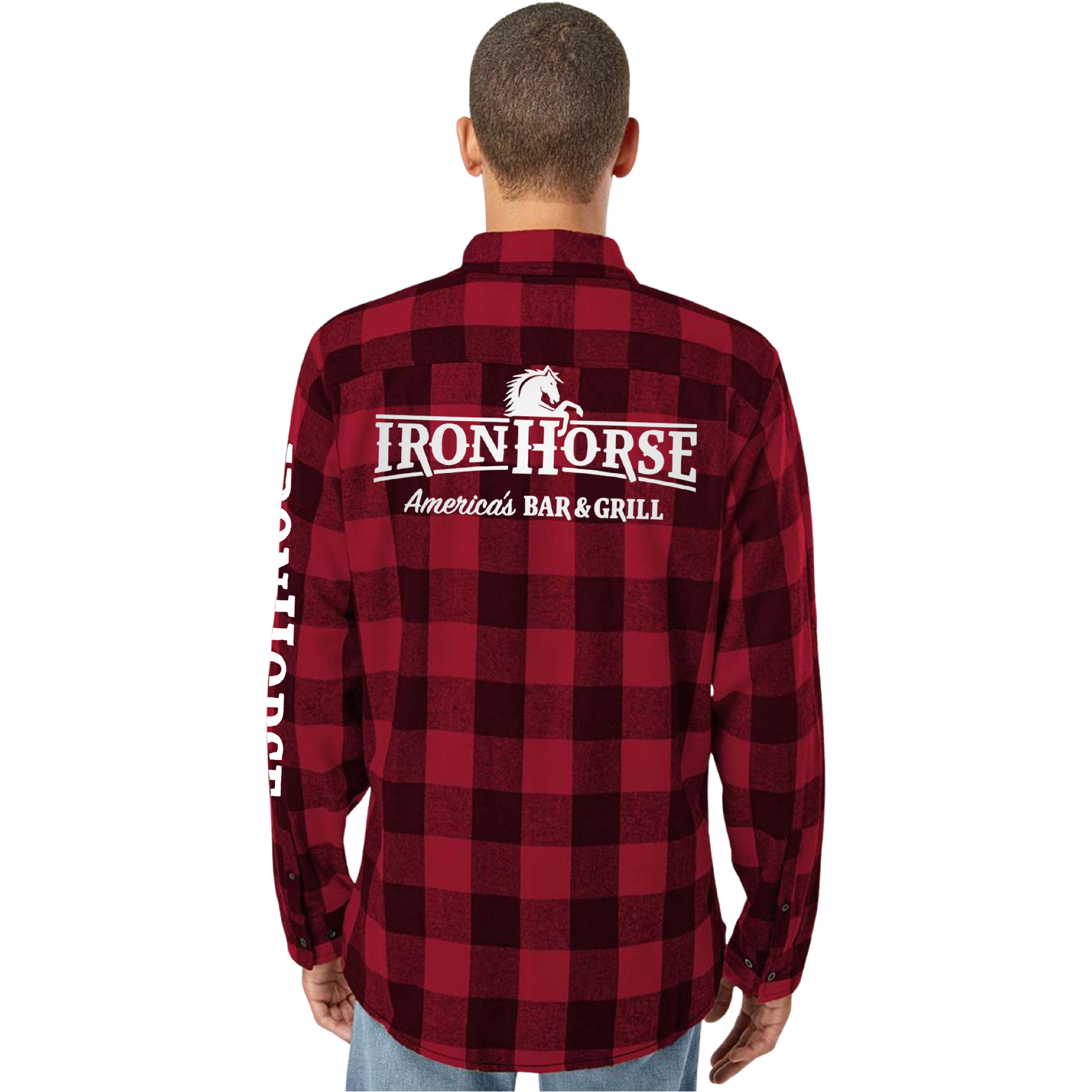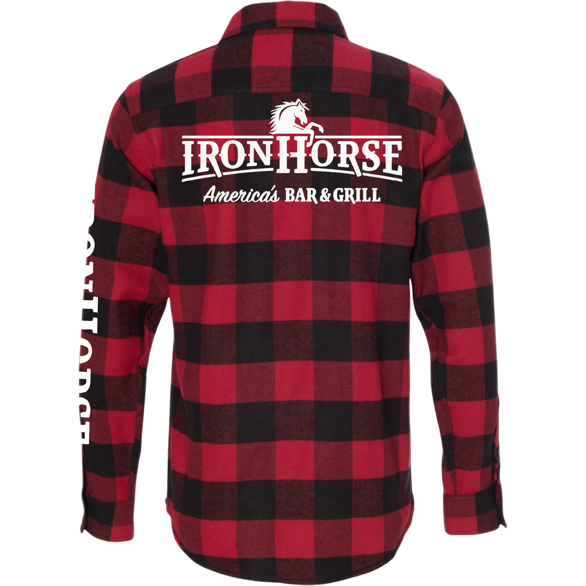 Rep the spirit of America’s Bar & Grill with this heavyweight flannel button-up, featuring bold red-and-black buffalo check and premium Ironhorse branding on both chest and back. Whether you’re on shift, off-duty, or just repping your favorite local spot, this shirt delivers comfort, durability, and unmistakable Ironhorse pride.